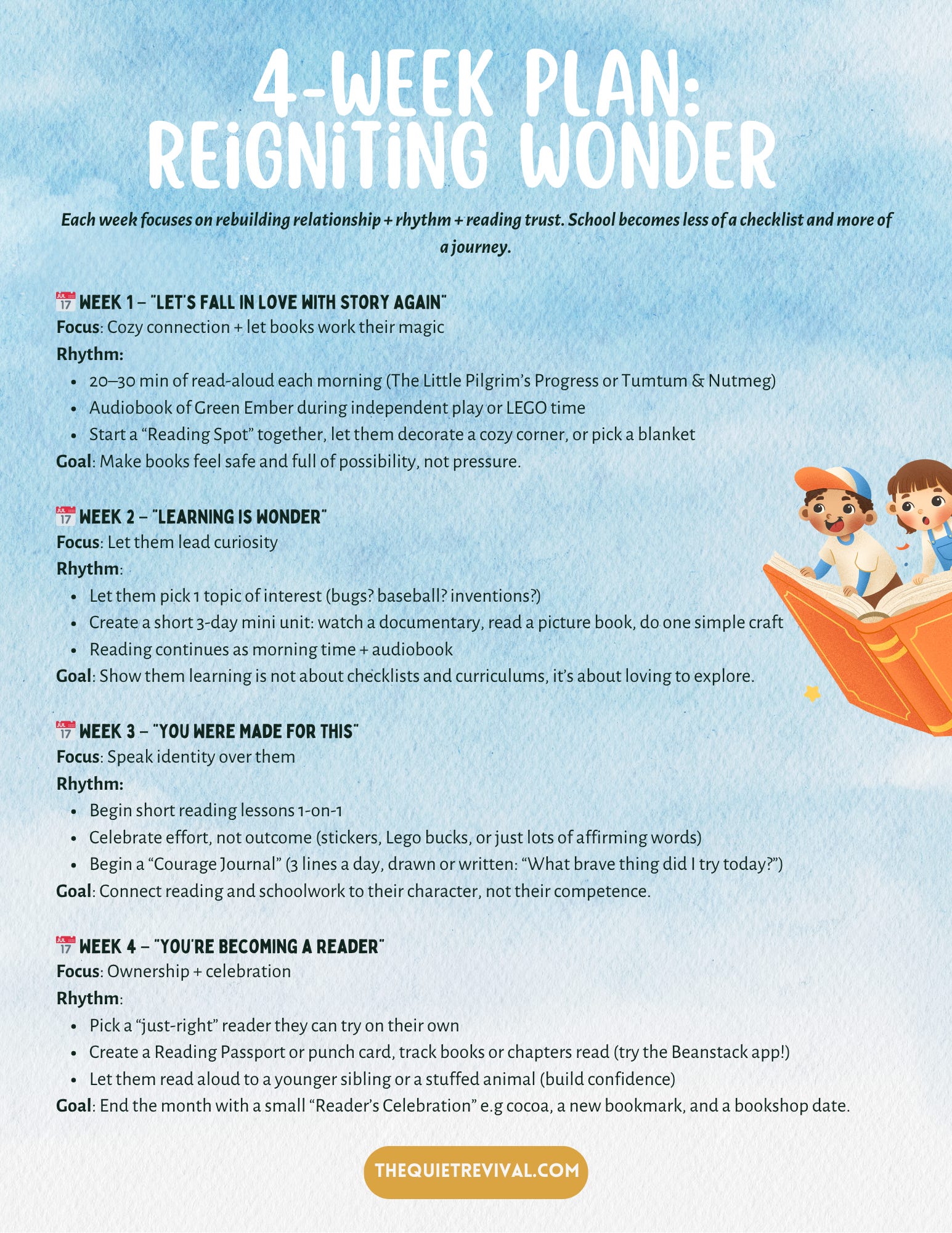Each week focuses on rebuilding relationship + rhythm + reading trust, so school becomes less of a checklist and more of a journey.