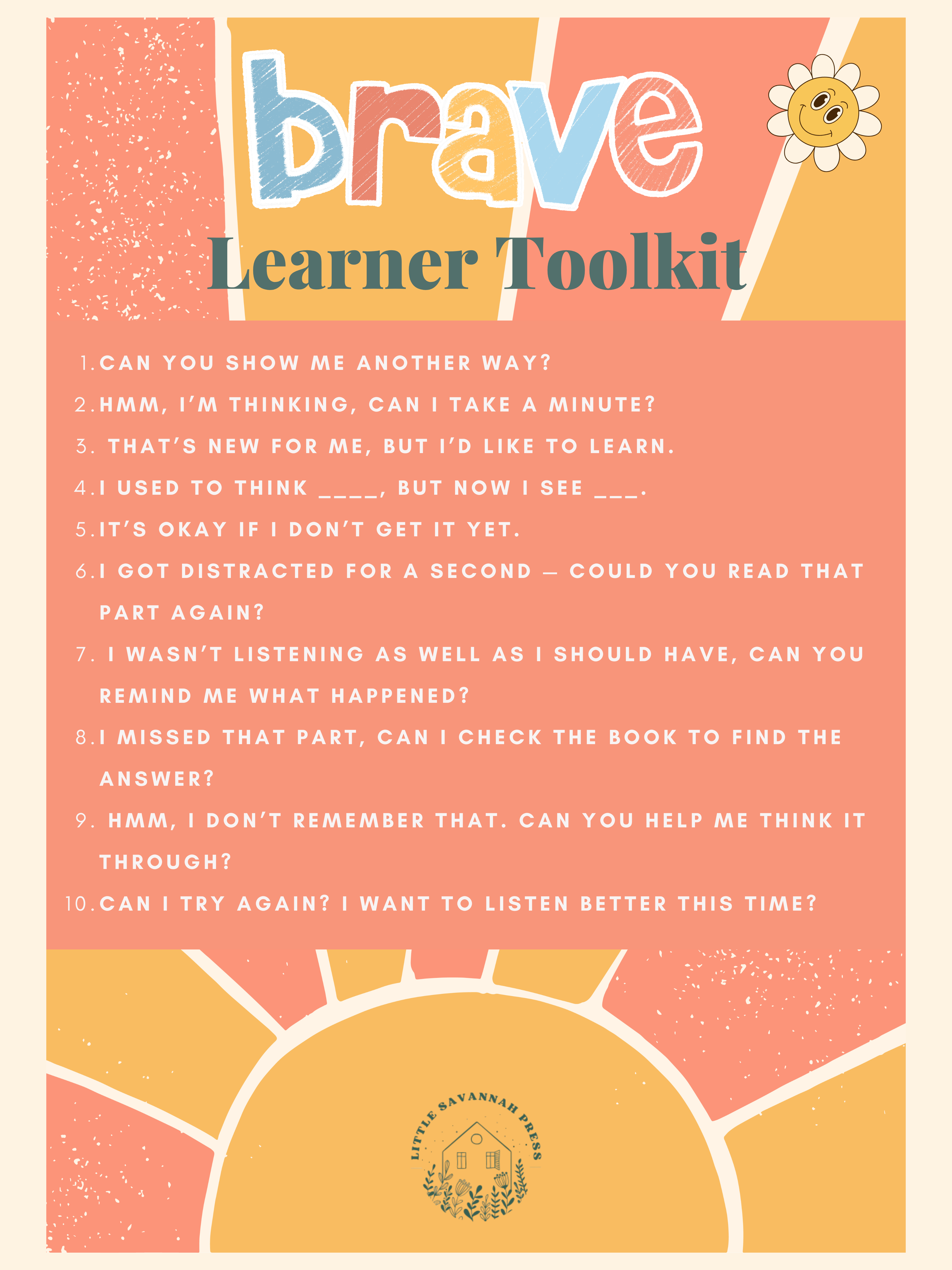 The Brave Learner Toolkit is a simple set of phrases your kids can use when they feel stuck or unsure. I’m pasting the phrases below, and a pretty PDF.